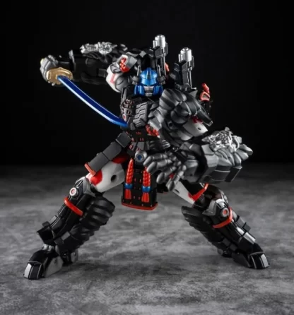 La série Iron Samurai IF-EX75 Oosarushogun d’Iron Factory est fabriquée en plastique durable, présente un haut niveau d’articulation et est très articulée. La figurine est construite selon des normes élevées et méticuleusement conçue avec précision selon les normes d’Iron Factory. Doté d’une palette de couleurs noire et rouge, Oosarushogun peut rapidement passer de la forme de gorille à celle de robot.
