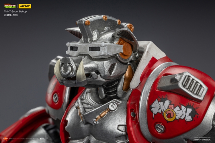 JoyToy étend sa magnifique gamme de figurines d’action Tortues Ninja avec Super Bebop ! La menace phacochère robotique mesure environ 13,6 cm de haut et offre une grande variété d’articulations pour des poses épiques et des jeux spectaculaires. Super Bebop est livré avec un support sectionnel, un support circulaire, des armes et des accessoires.