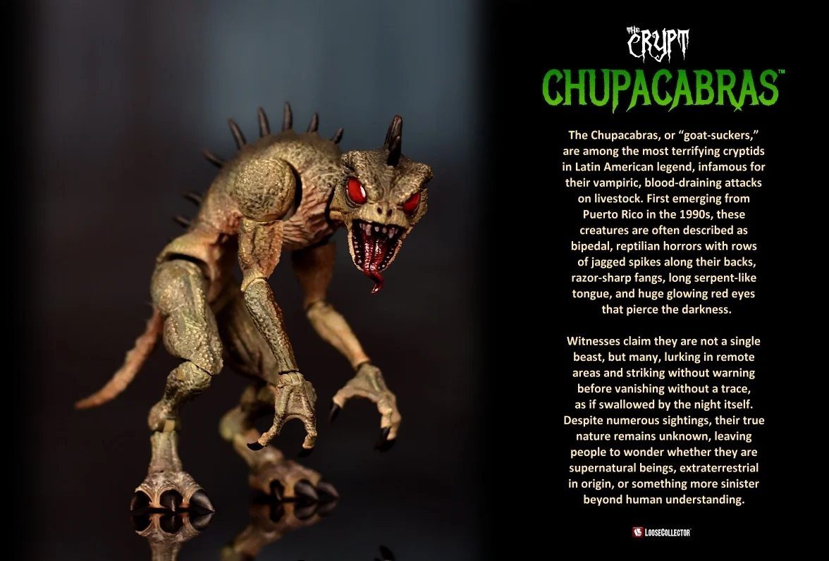 Les Chupacabras, ou « suceurs de chèvres », comptent parmi les cryptides les plus terrifiants de la légende latino-américaine, tristement célèbres pour leurs attaques vampiriques et sanglantes contre le bétail. Émergeant pour la première fois de Porto Rico dans les années 1990, ces créatures sont souvent décrites comme des horreurs bipèdes et reptiliennes, avec des rangées de piquants dentelés le long du dos, des crocs acérés comme des rasoirs, une longue langue serpenteuse, et d’immenses yeux rouges brillants qui percent l’obscurité.