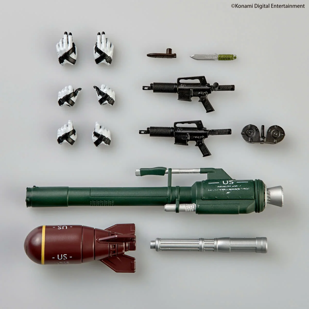La combinaison d’infiltration fabriquée en Soviétique est recouverte d’une peinture métallique pour recréer la texture du jeu. L’articulation unique de tout le corps permet des poses réalistes, incluant le combat rapproché (CQC) et des postures réalistes lors du maniement d’armes à feu. Le personnage au visage sévère a même des yeux mobiles ! Son fusil d’assaut emblématique, modifié en pistolet au canon raccourci, peut être équipé d’un chargeur illimité. Une ogive nucléaire miniature, un lanceur et un moteur-fusée à propulsion sont également inclus.