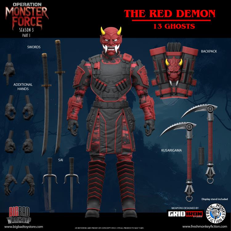 Lorsque le Roi Oublié a déterré la tombe d’Himiko dans les rues de Tokyo, certaines des tombes de ses gardiens ont également été exposées. Le masque connu sous le nom de « Démon rouge » a obligé un comptable fiscaliste à le ramasser dans les décombres. Le Démon prit alors possession du corps et de l’esprit du comptable, saisissant ses anciennes épées et attaquant la Légion d’Apophis. Lorsque le Roi Oublié s’est téléporté avec le sarcophage de la reine, le Démon a rejoint l’Opération Monster Force afin de retourner dans la tombe de la reine.