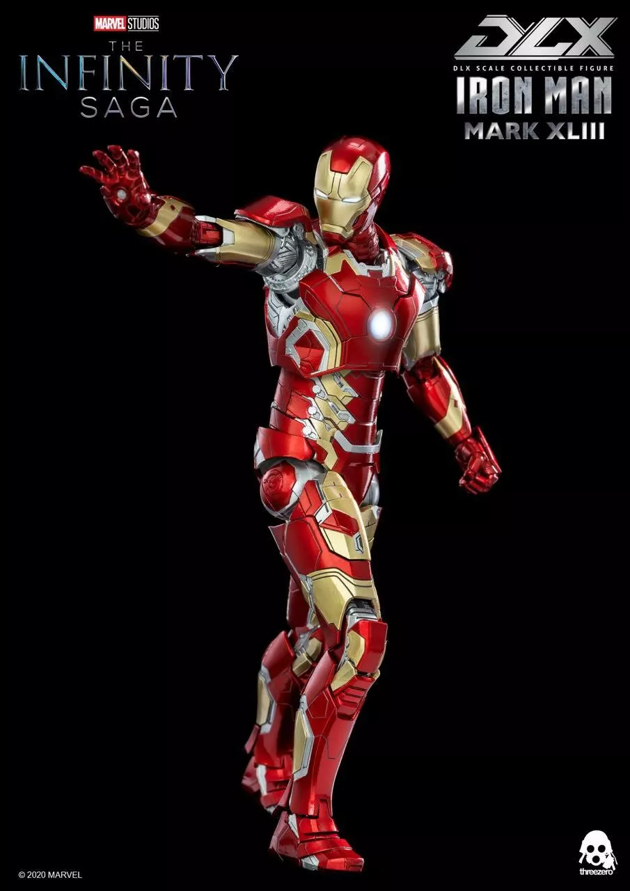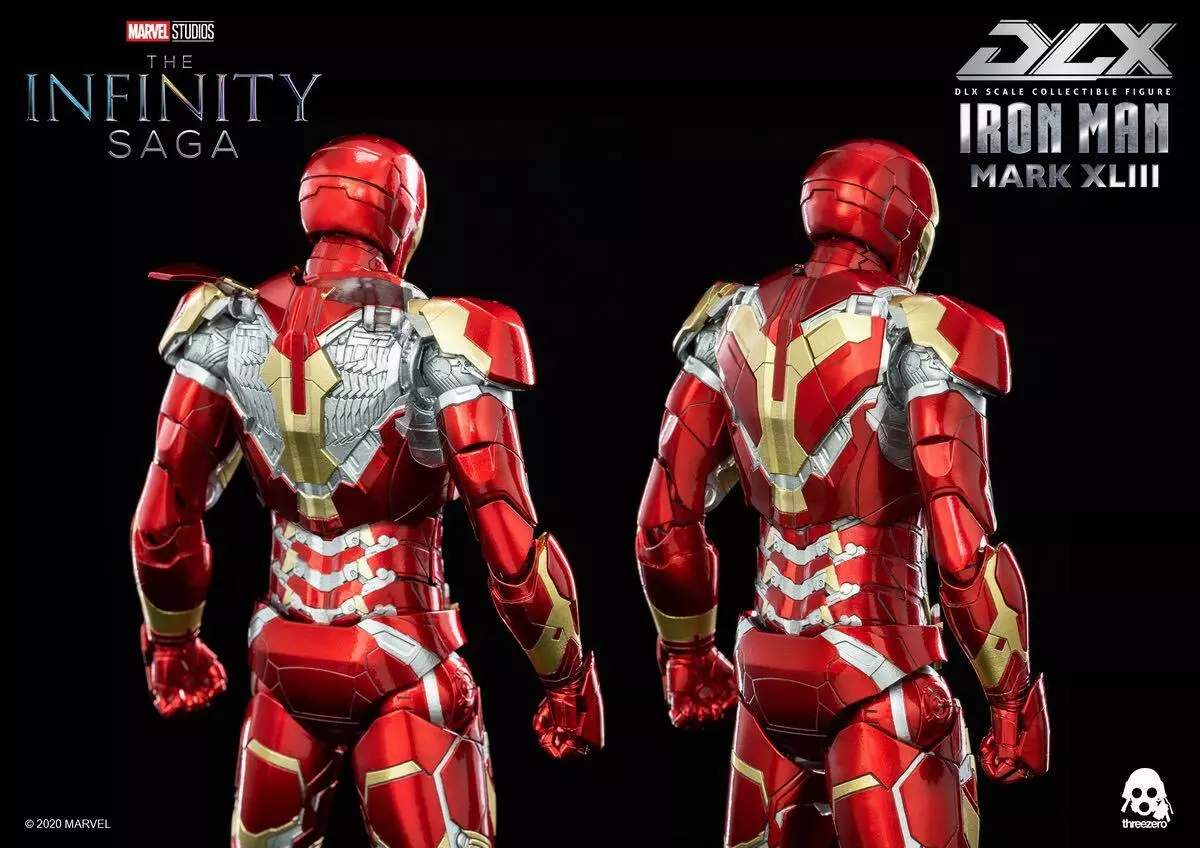 threezero a lancé en grande pompe la première série Avengers : Infinity Saga en collaboration avec Marvel Studios-DLX 1/12 Iron Man Mark 43. Le corps mobile du DLX 1/12 Iron Man Mark 43 mesure environ 6,5 pouces de haut (environ 16,5 cm), a 48 articulations mobiles et contient un cadre en alliage.